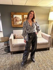 Pair this printed plunging neck top by Saunders Collective with sequin pants to take this slightly cropped blouse into cocktail attire territory.