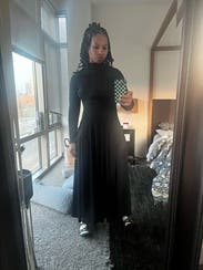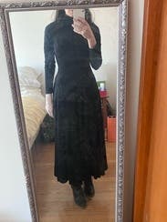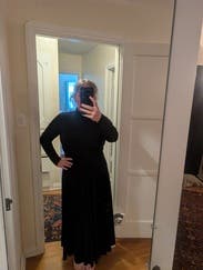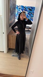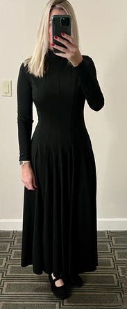 It’s always hardest to tell how a black garment is going to look from pictures and this wasn’t quite what I was looking for - it’s just a high neck, long sleeve, ankle length black jersey dress.its not really fitted or body-con and it does dip at the waist and flare in the skirt but I thought it might have a construction that was a top separated from the skirt with a belt seam and it does not. I wore it to a work event but to me because of the length a funeral or a semi-formal winter event would be better suited.