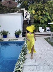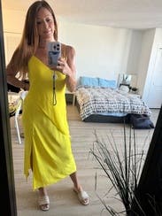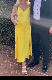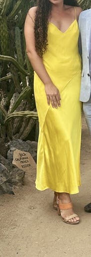 This dress made me feel hot and beautiful. This was worn for a wedding the bride had chosen yellow and I was apprehensive. Pairs with gold accessories and loved the whole night in this slip dress.