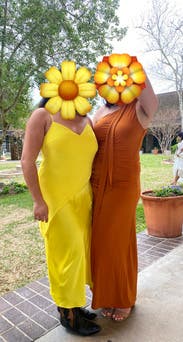 this is seriously one of the most beautiful dresses ever. The color is so beautiful and vibrant it’s practically GOLD. I got oh so many compliments! I never really wear yellow and was a little hesitant but it was perfect for a spring wedding. For reference I’m 5’4 and around 155-160 ish and got a size 8!!! Which is my usual size and it was perfection. Also for those wondering about a bra situation - I wore nipple covers (specifically the petals from target) and that was all I needed. There’s a paneling inside around the chest area which does the rest for you! Seriously if you’re thinking about renting this - DO IT. It’s amazing and beautiful and so comfortable! Cannot recommend enough.