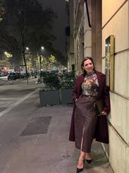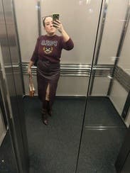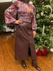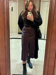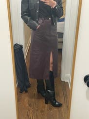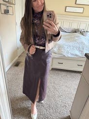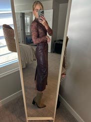 Really liked the look of this skirt for winter. I’m 130lbs and felt this ran a little small. I was able to wear it to a food & wine festival though and be relatively comfortable by just lifting it up a bit. Thought it was a brown skirt but it’s more of a plum in person. Really pretty color.