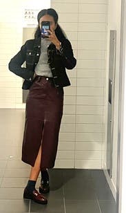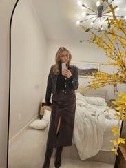 Ignore my messy room. This is THEE skirt for fall/winter 2024. So soft so flattering 10/10.