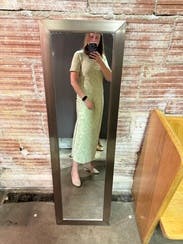 I’m very tall so the length worked on me as a midi. The details here—the diagonal zipper in the back, the seam in the front—are really nice. Overall I found the print just ok, maybe nicer for a more formal occasion than I needed it for.