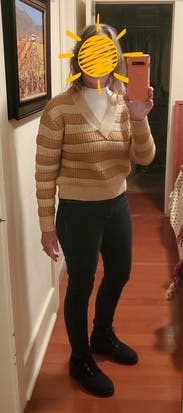 I think if something has sparkles, it should say so in the description…they are not my favorite. But this one is pretty subtle and soft. Most things that have a sparkly weave in them are scratchy. This is Soft and I enjoyed wearing it more than I thought I would. It’s not super flattering because of the horizontal stripes, but it felt vaguely festive.