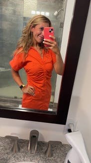 Absolutely stunning shade of red-orange for people with warm undertones! It could be described as a soft coral red. Vibrant without being too bright. I found the fit to be TTS for me— figure-skimming but not tight. For reference my measurements are 32in full bust, 29 under-bust, 24 waist, 30 high hip, 35 low hip/seat. I rented this for a work event that I ended up not attending, so I wore it to a casual rehearsal dinner instead. This isn’t the type of style that I’d wear on an everyday basis but I was tempted to buy just because the color and fit were so perfect!!