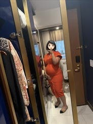 I think if I rent again I would get an 8. It was a little snug to start but loosened as I wore it. Had to wear shapewear. It is a reddish orange in color. No pockets.