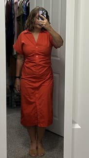This dress is comfortable, wore all day for work video calls from home. I like the length and button down style. The top felt large though, it made me look very broad in the shoulders. Not my favorite.
