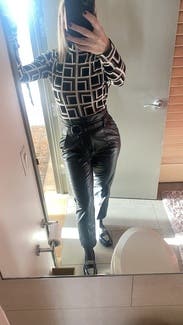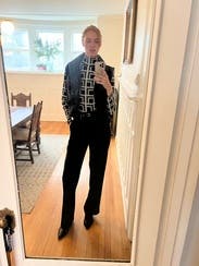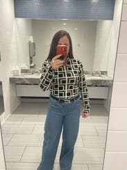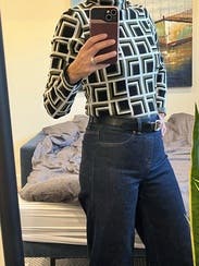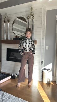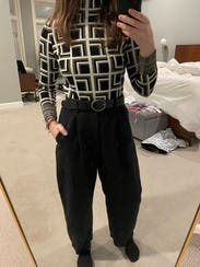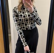 This top is a cool, retro, interesting pattern. I thought it was grey and black, but it’s actually more of a light olive green which was more fun. I didn’t love the fabric though and found the neck to be itchy. The length was tricky in that I kept having to check it was tucked in. (And I’m 5’3” with a short torso.) So fun for a day but probably wouldn’t rent again.
