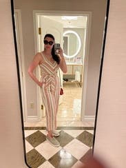 Wore this wine tasting in Santa Ynez. It was a little chilly that day so I paired with brown booties and a Jean jacket. This is Avery versatile piece that could be dressed up or down. I wore it three different times. Has a little stretch in the back. No adjustable straps. I have a very small chest so there was a tiny gap but will fit nicely on anyone with size B/C boobs