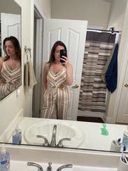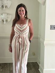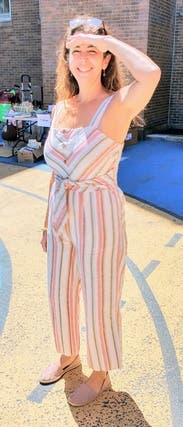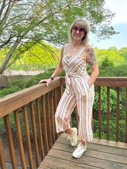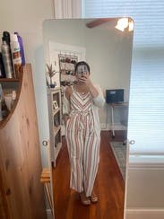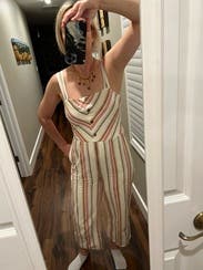 I like this jumpsuit more in pictures (even on myself) than I did in person. The straps were way too long (and are not adjustable), so I had to pin them. The length is great on my 5 foot frame, but I did feel like there was extra fabric around my belly/torso, and it didn't look flattering in person. The fabric is fairly thick (almost like canvas) and wrinkles pretty easily. I did love the colors and the stripes, and the pockets! But probably won't rent again.