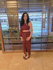 The dress has a bit of an "Indian" vibe to it with a semi crop/skirt effect which I love. Like others said watch the zipper because if you get down on the dance floor it may slide open. Otherwise fit well and if you walk fast your legs will show which was a little misleading from pictures (if this is of concern). Overall LOVED IT!