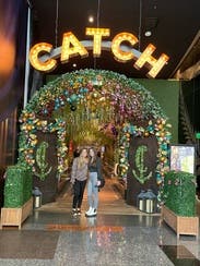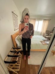 I wore this for a couple of dinners out with jeans. It was different for me with the an arm and a shoulder out, but it looked good and I got compliments. I hadn't zoomed enough and didn't realize the design is made up of pink flowers, but it was very cute and comfortable.
