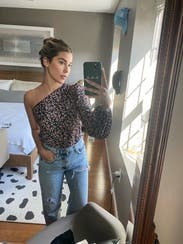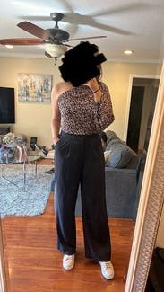 Loved this top for a date night. The one sleeve is sexy but not revealing. Cute fabric and color.