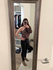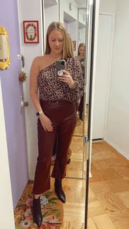 This worked well with jeans and silver block-heal slingbacks as well as faux leather cropped pants and black heals