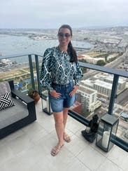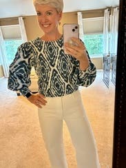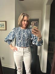 Loved this shirt. Could be dressed up and down. The bow in the back made it uncomfortable to sit in some chairs, but loved the pattern and cut of this top.