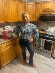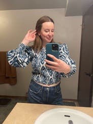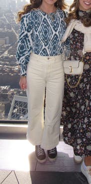 Hard to tell but I wore it with wide leg jeans that are mid-rise, the jeans were a mistake. Would def look cuter with a high waisted jean so I wouldn't have to worry about the crop. The size was perfect. Wore it for a fall travel day that went straight to activities after arriving.