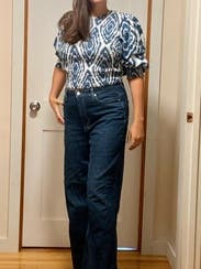 This shirt is very cropped on my 5'4" figure. It was cute. The arms were the right amount of puffy while the wrists were right. The color and pattern are very pretty