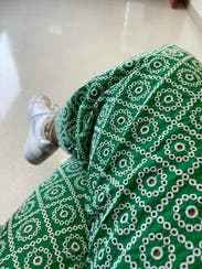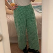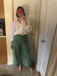 Was a tiny bit snug in the waist. Has an white eyelet lace-type texture/embroidery on the sturdy beautiful green fabric. I love the wide legs.