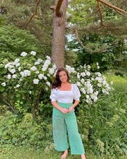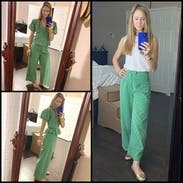 I rented these pants with the matching top. From the side, the outfit looks really cute; however, I felt like the pants were too wide to wear with the top, or the peplum detail was too much for the width of the pant leg... either way, I thought the outfit made me look wide. I ended up wearing the pants separately and loved them! They are comfortable, and the color and material are eye-catching. The waist is TTS, and the wide leg is nice for muscular legs. Only con- wish they had pockets!