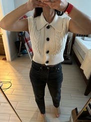 This cropped sweater vest is not super WOW, but it is perfect for crisp fall days when it's too warm to wear a full-on sweater. The unique buttons and collar set it apart from basic sweater vests. I wore it casually on weekends. It's especially good for a petite gal like me.