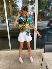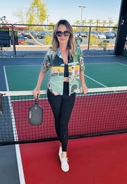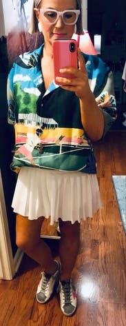 I typed tennis into the search box and got this shirt and wore it for a fun look to my pickleball birthday party. I planned to do a front knot which is why I got the baggier size, but the tennis player on the front is there and disappears if you knot it up. If I were to do this again, I’d go a size down since I ended up wearing it untucked the first time