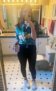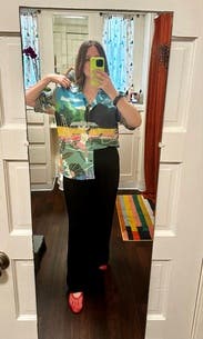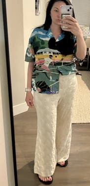 Wore this so many times and got compliments every time. So soft and billowy. The right amount of oversized. Colors go with everything. Styled with black satin wide leg pants (pictured) also wore it open with a white tank and utility shorts.