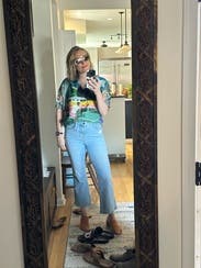 Obsessed with the print. So much fun. Light weight shirt that can be dressed up with a jacket. I enjoyed it casually as pictured and also more dressed with flair denim and block heel boots and long jacket