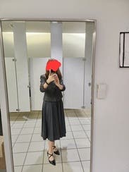 Loved the rich navy and sharp pleating—felt polished but playful. I sized down based on reviews and it was spot-on for a flattering fit. Great for work or a night out with a bold lip and boots!
