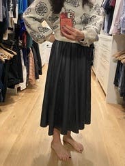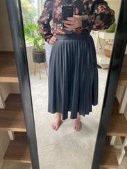 Lovely pleated pleather skirt. It does get warm around waist line. Could probably size down 2 sizes, size down at least one. Tons of compliments. Great for work or weekend festivities. Dress up or down.