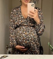 I’m 32 weeks pregnant and found this dress very flattering and a well designed wrap dress. My recommendation is to size up if you’re in your third trimester and the chest was on the tighter end. I also wore block heels since the dress is long. It didn’t drag on the ground, however, I had to be mindful when walking up the stairs.