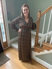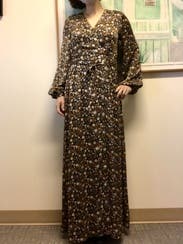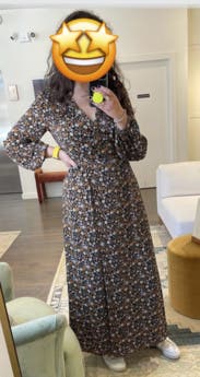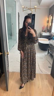 The most autumny fun fall dress. The pattern is so pretty and the dress itself is so comfortable. The slit goes all the way up your leg, but very easy to keep covered with it being a wrap dress. I got so many compliments --one of my favorites that I have rented!!