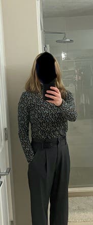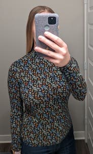 Wore this and the Jason Wu faux leather black wide legged pants to a winter wedding rehearsal and 4 weeks after having my second child and felt absolutely wonderful! Thin mock neck long sleeve with a beautiful print that doesn’t get distorted as the material stretches.