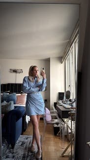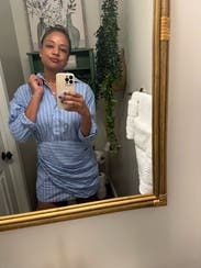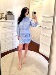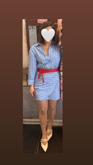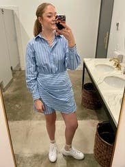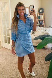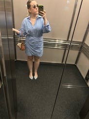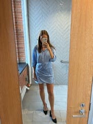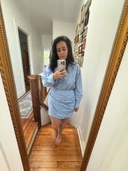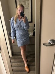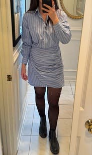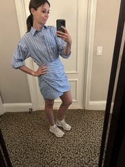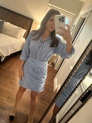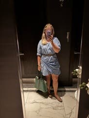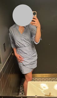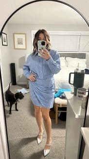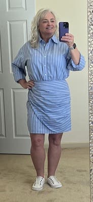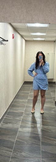 Giving this 5 stars because I really love this dress and its take on a simple button up shirt dress. The skirt swoop in the front is so fun and I got a lot of compliments at work. Will say I could’ve sized down because the dress was a tad big. And it did wrinkle easily. But I still loved it!