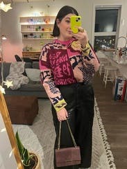 so cute! such good quality and makes a great statement sweater. wore with blue jeans, grey jeans and leather pants - very versatile. ordered a L for an oversized fit, would maybe do a M to make it a little shorter - but will order again!