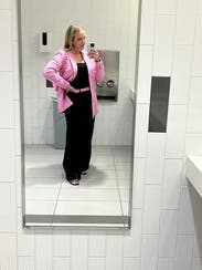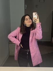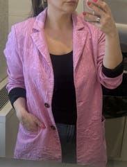 Obsessed with the pink color and the floral tone on tone design. For me, this ran a bit on the big side with the sleeves and overall length being a bit long. However, I made it work and had fun pairing it with all black, and happened to have a matching belt which helped pull it all together. Would size down if in between sizes - plenty of room in the shoulders/arms for those a bit heavier on top.