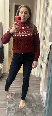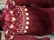 Red fair isle knit (36% Recycled Polyester, 20% Alpaca, 20% Wool, 18% Acrylic, 6% Elastane). Sweater. Long sleeves. Crewneck. Pull on. 21" from shoulder to hemline. Imported.
