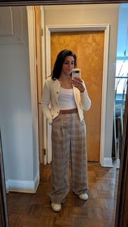 I loved the pattern and color of these pants (although they are a little more blue than they look in the picture). The fit was a little weird - slightly loose in the waist but a little snug in the hips/butt on me. Overall I loved the look for a work outfit, but would probably not rent again due to the scratchy/uncomfortable material of the pants.