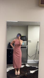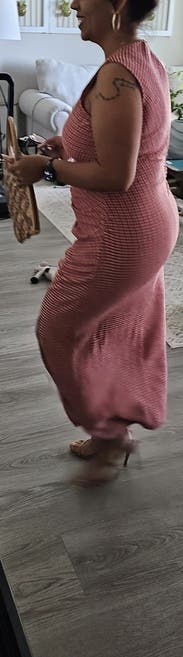 Really great length and perfect for a formal work event. The coloring and front ribbing is flattering! Would be perfect if it was more fitted, especially around the waist. It does fit slight large.