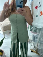 Perfect tailored look that elevates any bottom. I rented for a girls trip to Charleston and was able to also wear it to work in the spring in NYC. One note is that the buttons in the middle do gap awkwardly when you're literally just breathing so if you have a larger chest I'm not sure if this top is the best/ I'd definitely recommend sizing up. It has the grip lining on the inside of the top which I really appreciated as I never felt like I was in danger of it falling down. The length was perfect that I felt elongated but it never was awkward. 10/10 would rent again