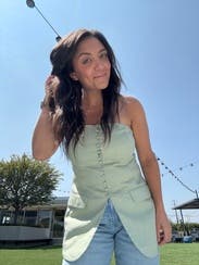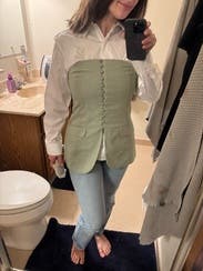 This top is such a unique and versatile piece! The structured buttons and tailored fit give it a chic look, though I did notice the buttons pull slightly at the chest compared to the lower half. Still, it’s incredibly flattering and easy to style. I love layering it over a crisp button-down for a polished, work-appropriate vibe, and it also looks great dressed down with jeans for a more casual look. Definitely a statement piece that transitions beautifully from office to weekend!