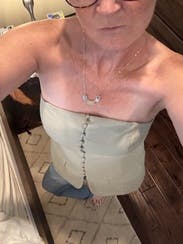 I love this top, however it does not unzip all the way so if you can’t fit it over your head/bust you have to undo some buttons, and boy are they a pain. You definitely need a certain type of strapless bra with this, just not sure what kind since none of my worked well