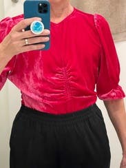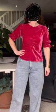 I gave this 3 stars because of the fit. According to other reviews, this runs small, so instead of my normal medium, I ordered a large and good thing I did. It just fit as a large. The ruching was flattering, but the problem is that it is cropped and really forces you to wear a high-waisted pant. I wore this to a Christmas cocktail and dinner party (got lots of compliments on it!), but felt uncomfortable all evening, especially when seated. The top would rise up above my mid-rise leather pants, showing skin, so I was constantly adjusting it and trying to pull it down. Standing wasn't an issue and it looked great as long as I wasn't sitting down. But, hey. That's pretty high maintenance for a party top. As a result, I wouldn't rent this again. If you are younger or wore a different pant, I can see it working and it could be a great rental for that person, just not me.