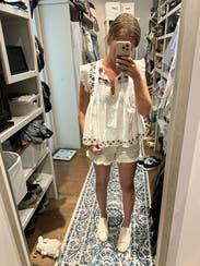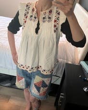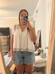Lots of compliments every time I wore this. Loved the colors and detail on the embroidery. The style is a loose fit but with skinny years or a straight skirt it was super cute. Will definitely rent again!