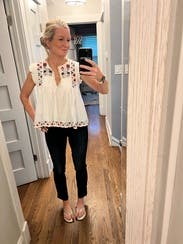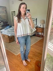 Loved the details of this peasant blouse. I wore a tank underneath as the arm holes and neck slit were deep for daytime. The weight is heavier linen/ cotton, but it is flowy and swingy so could work for hotter days. Beautiful embroidery- really something special. Paired it with slim jeans to balance out the proportions- it is very bell shaped. The top dips lower in the back, and your waist is visible in front, which makes it obviously not maternity.