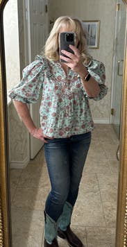 Love the color and cut of this shirt. The puff sleeves are significant but don’t overwhelm my frame. I’m usually an XS in tops and this fit true to size. Really fun shirt I would definitely rent again!
