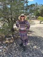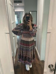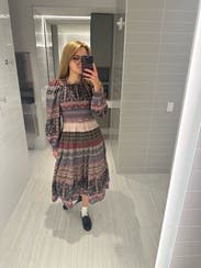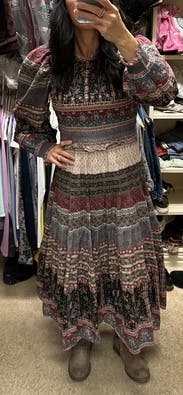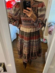 I was hesitant to get this because the print looked so prarie online. It looks even cooler in person! I loved the print, color scheme, and fit of the dress. The sleeves have a little puff without being too much. I went with the 6 because the chest is smocked and stretchy. I'm 32G/37 in chest and usually opt for an 8 to accommodate that, but the 6 fit me great (30 in waist/38 in hip)