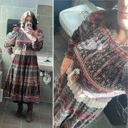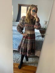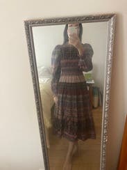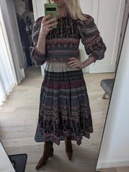 This is a beautiful dress but I didn’t love it as much as I thought it would. I don’t care that much about a garment being flattering, but this looks like it would be very waist-cinching but actually was very bulky everywhere - torso, skirt, sleeves. On the other hand, the fabric was super light cotton, so it also might be better for summer or a fringe season. I ended up wearing it on a work from home day and it was good for that purpose as it’s pretty on camera and very comfortable.
