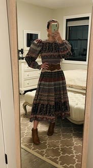 I wore this dress to work, to a dinner with friends, and to a Halloween event with family. I got so so so many compliments from my high school students. The bodice is stretchy and flattering but still modest if that’s your thing. The fabric is also really soft and cozy! Would buy it if I could afford it :)
