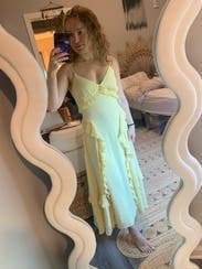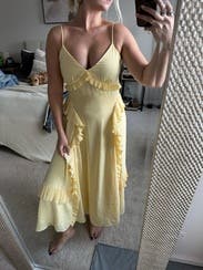 So gorg! Perfect for the butter yellow trend. Loved the ruffles. Thin material light and breezy but does show the spanx seam but oh well. Perf semi formal vibes