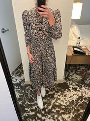 Wore to work and was pleased with the comfort and versatility of this dress. Neckline buttons were functional, but the dress also has a back zip. Loved how dramatic the sleeves were, and appreciated the elbow length that kept them out of the way